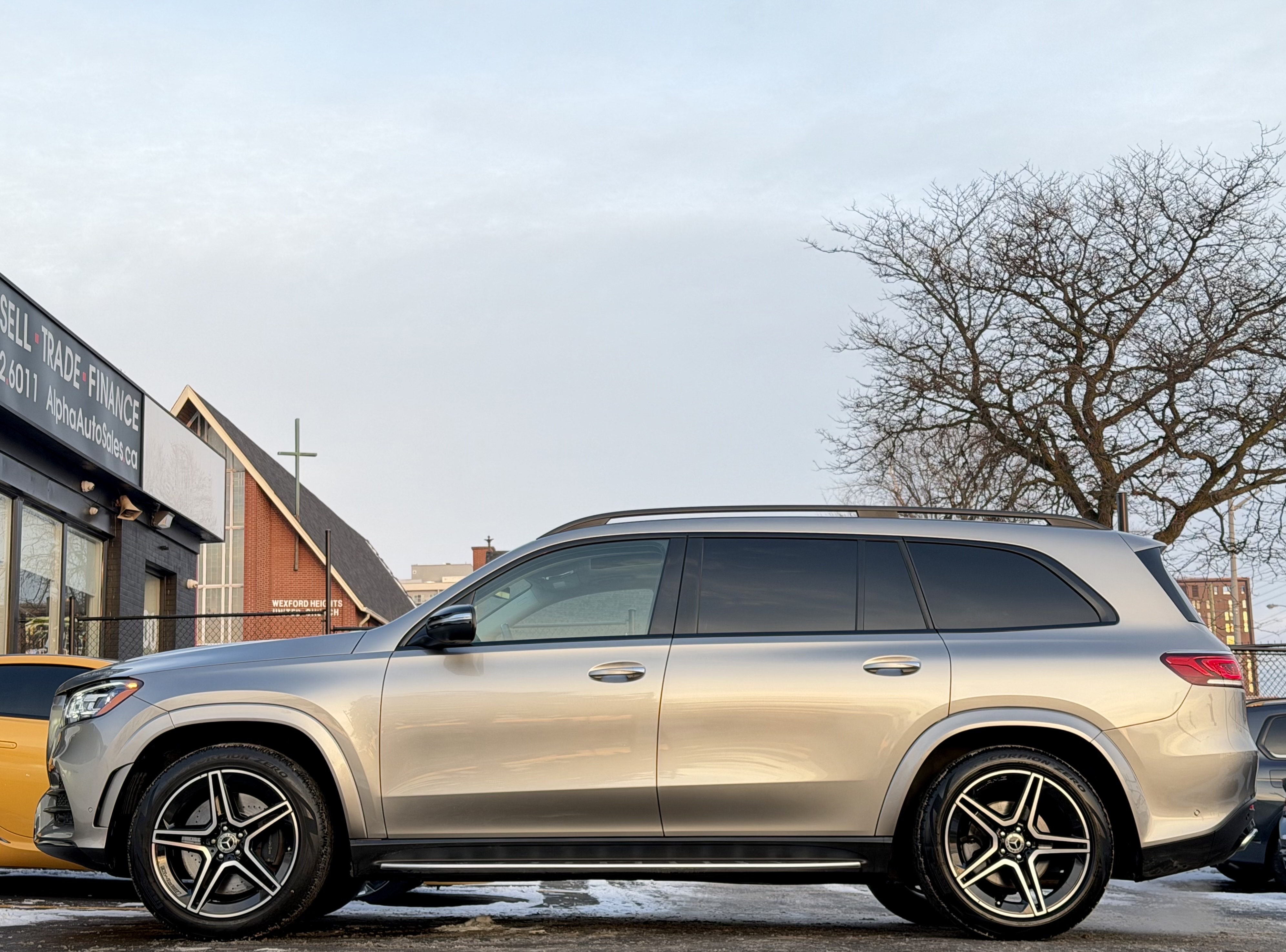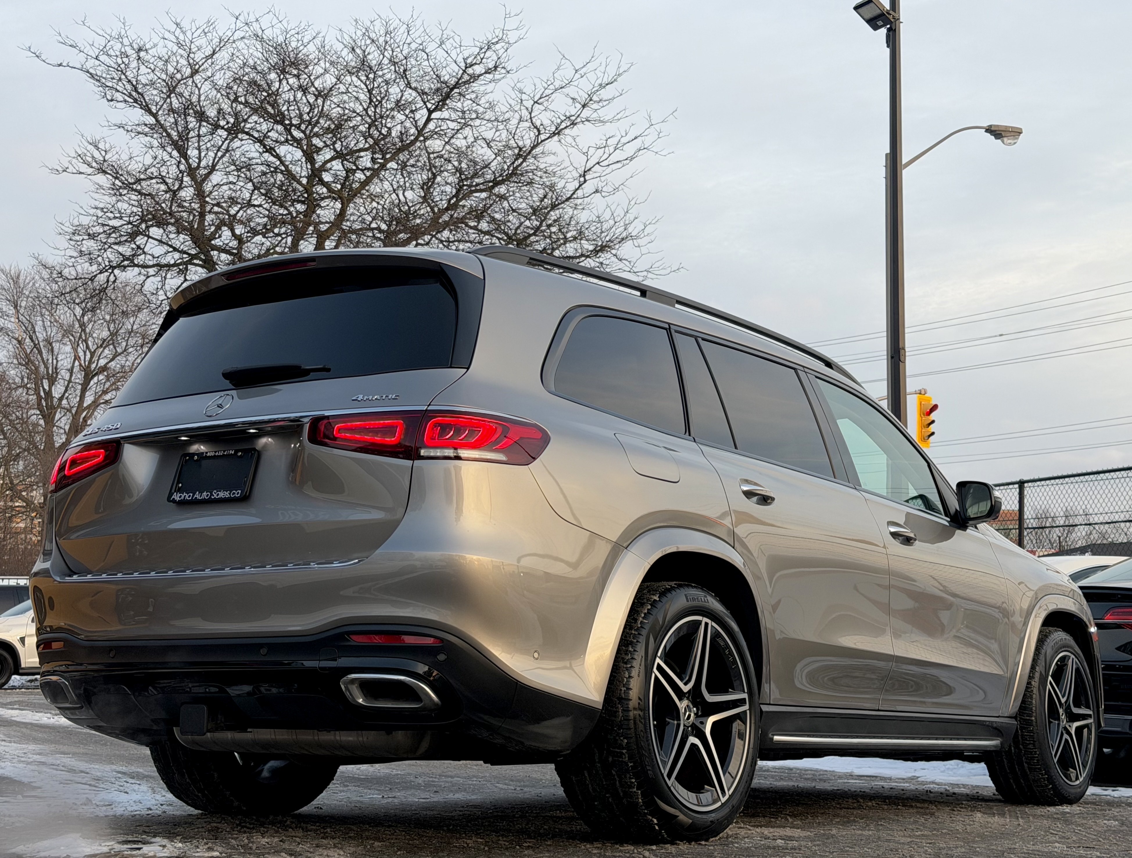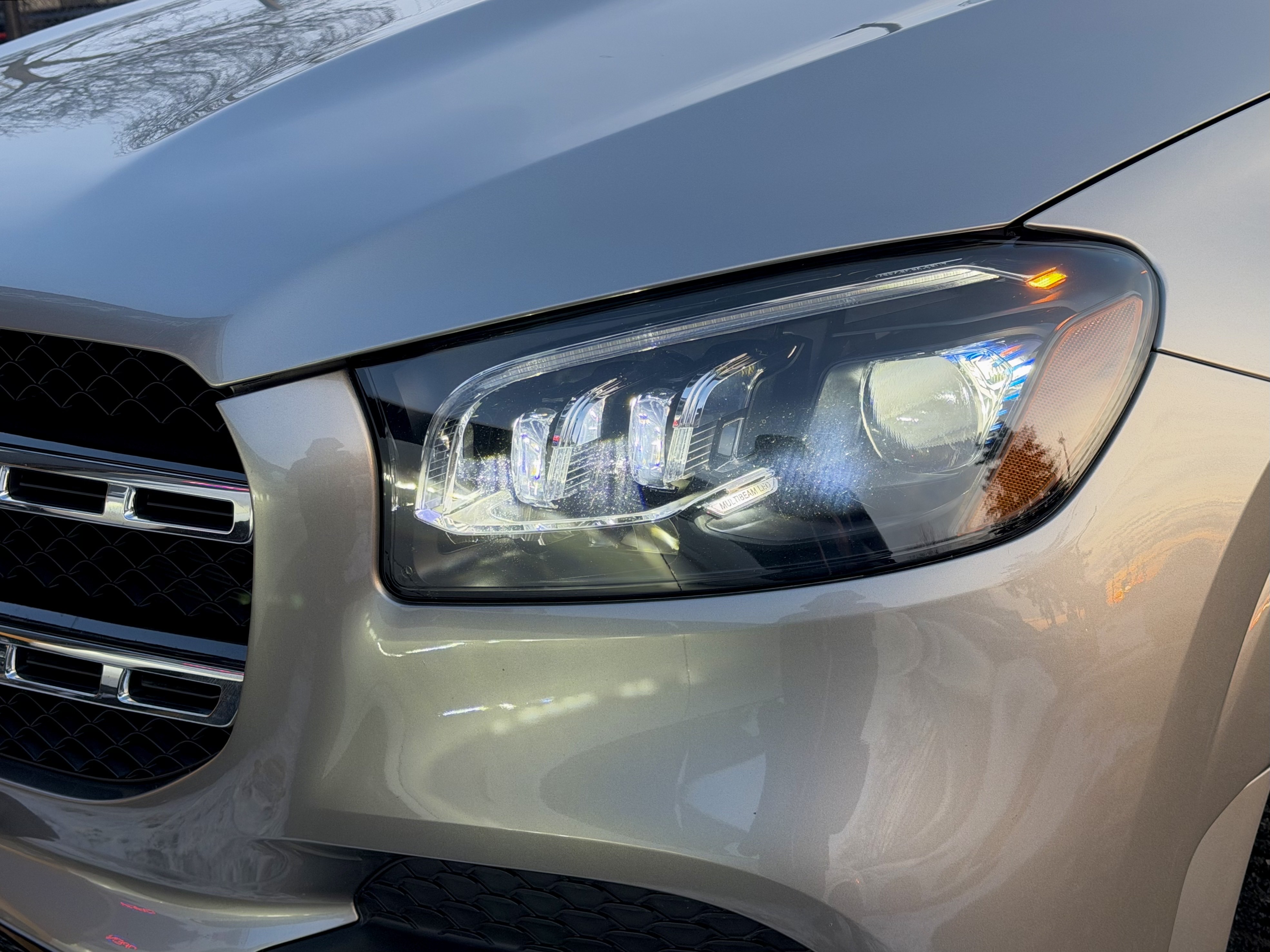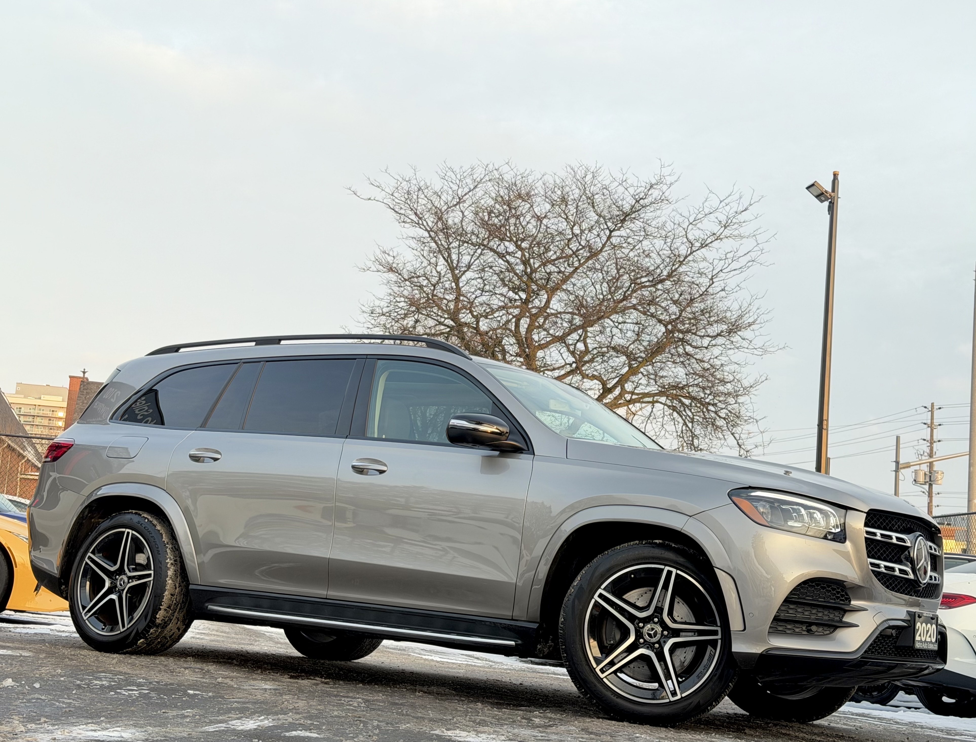 Mercedes GLS450 4MATIC - AMG Night Package - Premium Package - Intelligent Drive Package - Technology Package - Aluminum Running Boards - 7 Seater - Mojave Silver Metallic on Espresso Brown Interior - Carfax Verified - No Accidents - Low KM's ONLY 55k - Leather Heated/Cooled Seats, Panoramic Sunroof, 360 View Camera, Apple Carplay, Android Auto, Head up Display, Intelligent Radar Cruise DISTRONIC Plus, Keyless Go, Wireless Charging, Ambient Lighting, Blind Spot Assist - Fully Loaded!